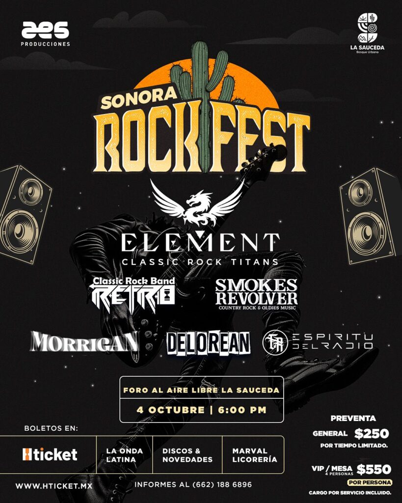 Sonora Rock Fest El Foro Al Aire Libre volverá a vibrar con la primera edición del Sonora Rock Fest: Clásicos que viven, Rock que trasciende. Este próximo 04 de octubre, a partir de las 6:00 pm en el Foro al aire libre de La Sauceda.